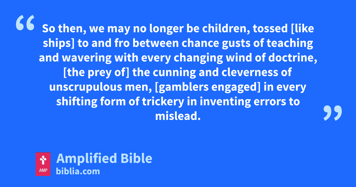 So then, we may no longer be children, tossed [like ships] to and fro between chance gusts of teaching and wavering with every changing wind of doctrine, [the prey of] the cunning and cleverness of unscrupulous men, [gamblers engaged] in every shifting form of trickery in inventing errors to mislead.