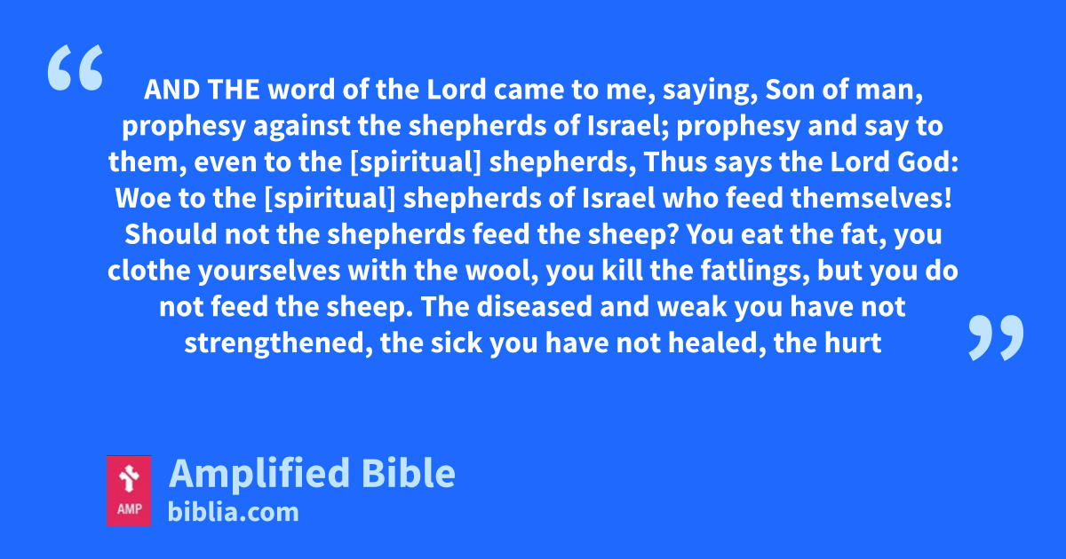 AND THE word of the Lord came to me, saying, Son of man, prophesy against the shepherds of Israel; prophesy and say to them, even to the [spiritual] shepherds, Thus says the Lord God: Woe to the [spiritual] shepherds of Israel who feed themselves! Should not the shepherds feed the sheep? You eat the fat, you clothe yourselves with the wool, you kill the fatlings, but you do not feed the sheep. The diseased and weak you have not strengthened, the sick you have not healed, the hurt