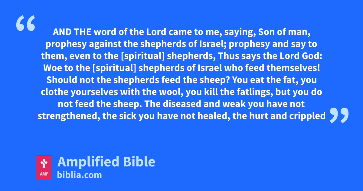 AND THE word of the Lord came to me, saying, Son of man, prophesy against the shepherds of Israel; prophesy and say to them, even to the [spiritual] shepherds, Thus says the Lord God: Woe to the [spiritual] shepherds of Israel who feed themselves! Should not the shepherds feed the sheep? You eat the fat, you clothe yourselves with the wool, you kill the fatlings, but you do not feed the sheep. The diseased and weak you have not strengthened, the sick you have not healed, the hurt and crippled