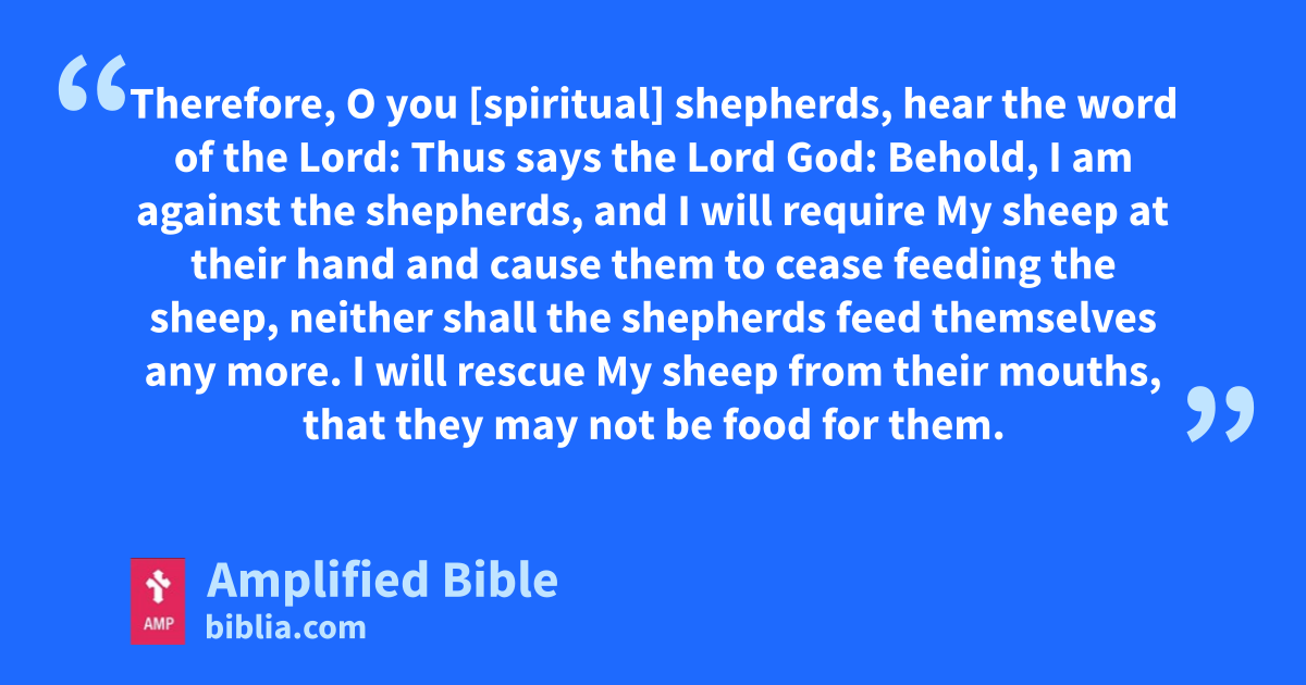 Therefore, O you [spiritual] shepherds, hear the word of the Lord: Thus says the Lord God: Behold, I am against the shepherds, and I will require My sheep at their hand and cause them to cease feeding the sheep, neither shall the shepherds feed themselves any more. I will rescue My sheep from their mouths, that they may not be food for them.