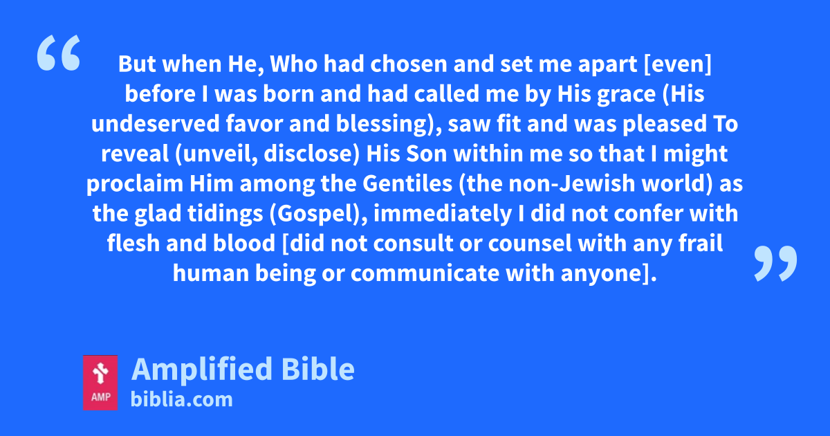 But when He, Who had chosen and set me apart [even] before I was born and had called me by His grace (His undeserved favor and blessing), saw fit and was pleased To reveal (unveil, disclose) His Son within me so that I might proclaim Him among the Gentiles (the non-Jewish world) as the glad tidings (Gospel), immediately I did not confer with flesh and blood [did not consult or counsel with any frail human being or communicate with anyone].