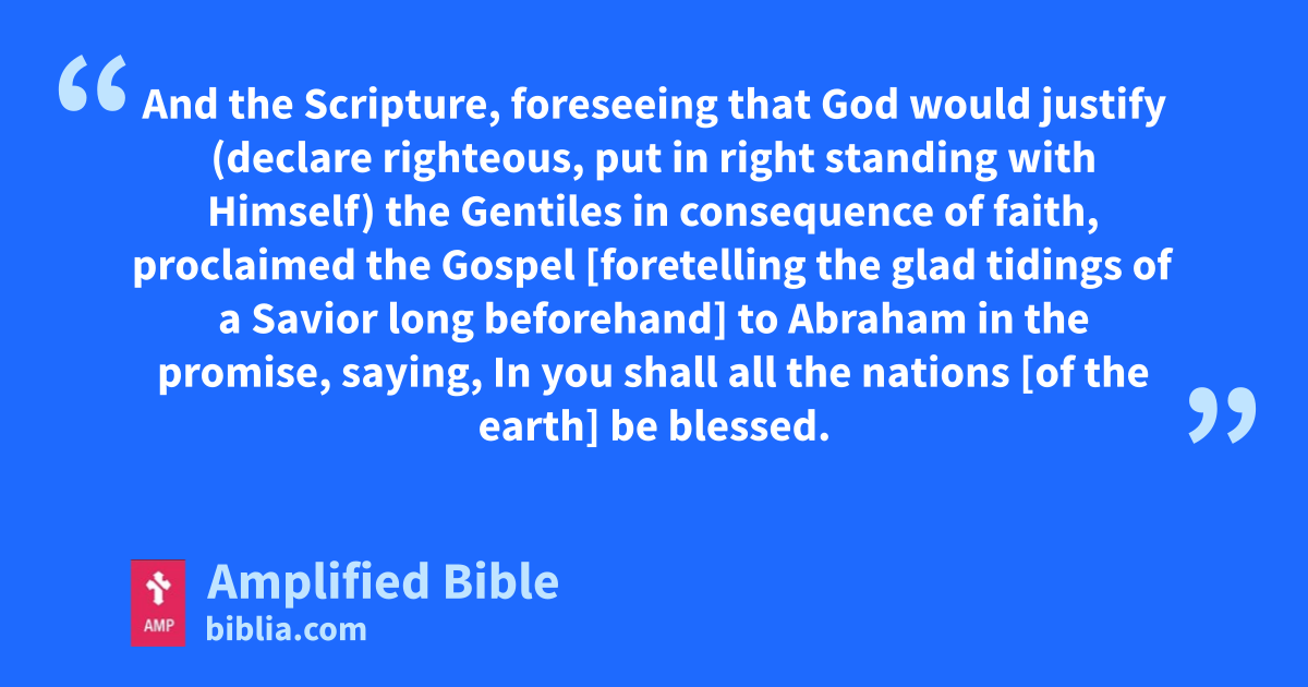 And the Scripture, foreseeing that God would justify (declare righteous, put in right standing with Himself) the Gentiles in consequence of faith, proclaimed the Gospel [foretelling the glad tidings of a Savior long beforehand] to Abraham in the promise, saying, In you shall all the nations [of the earth] be blessed.