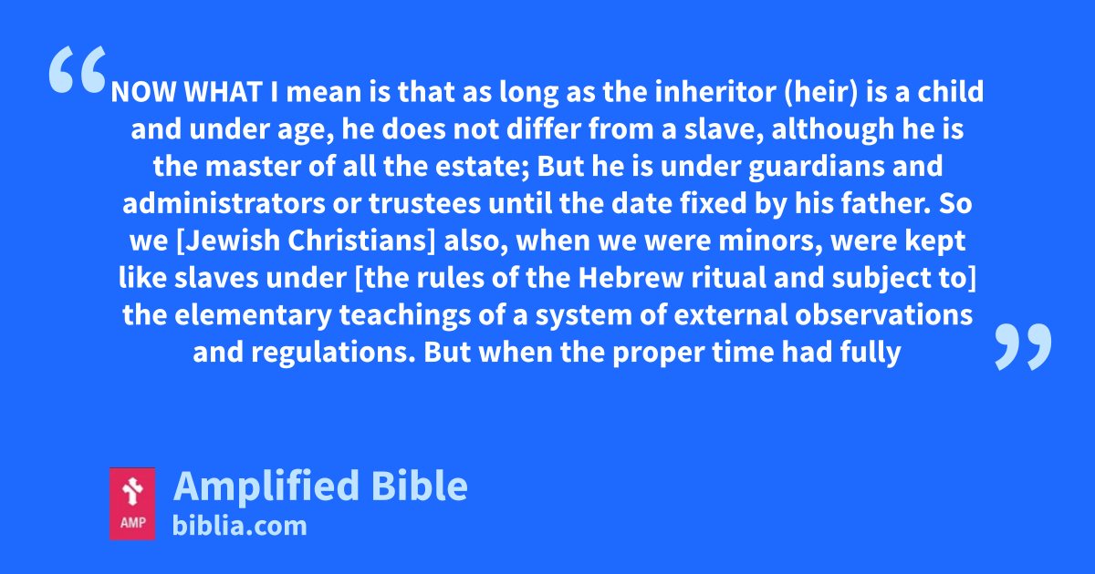 NOW WHAT I mean is that as long as the inheritor (heir) is a child and under age, he does not differ from a slave, although he is the master of all the estate; But he is under guardians and administrators or trustees until the date fixed by his father. So we [Jewish Christians] also, when we were minors, were kept like slaves under [the rules of the Hebrew ritual and subject to] the elementary teachings of a system of external observations and regulations. But when the proper time had fully