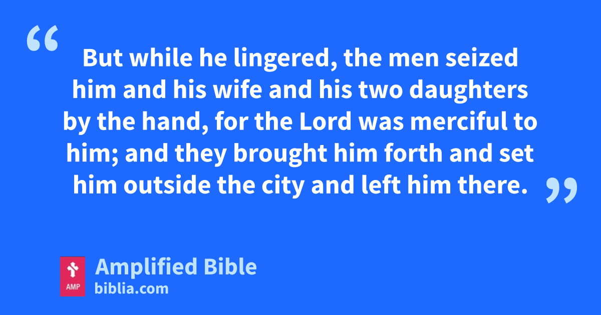 But while he lingered, the men seized him and his wife and his two daughters by the hand, for the Lord was merciful to him; and they brought him forth and set him outside the city and left him there.