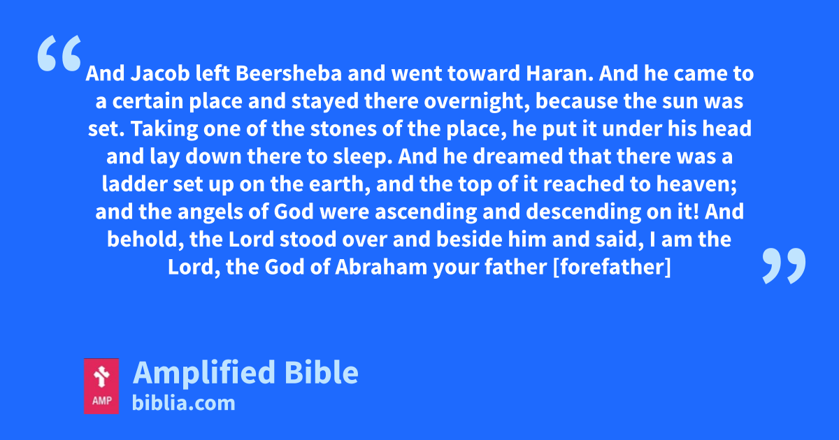 And Jacob left Beersheba and went toward Haran. And he came to a certain place and stayed there overnight, because the sun was set. Taking one of the stones of the place, he put it under his head and lay down there to sleep. And he dreamed that there was a ladder set up on the earth, and the top of it reached to heaven; and the angels of God were ascending and descending on it! And behold, the Lord stood over and beside him and said, I am the Lord, the God of Abraham your father [forefather]