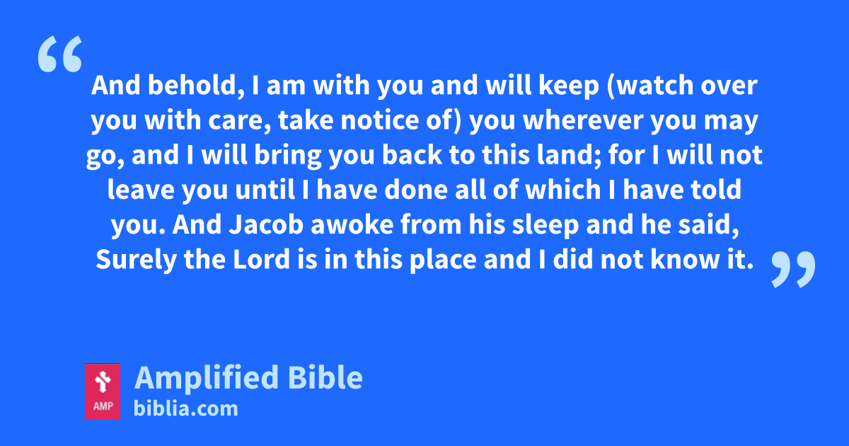 And behold, I am with you and will keep (watch over you with care, take notice of) you wherever you may go, and I will bring you back to this land; for I will not leave you until I have done all of which I have told you. And Jacob awoke from his sleep and he said, Surely the Lord is in this place and I did not know it.