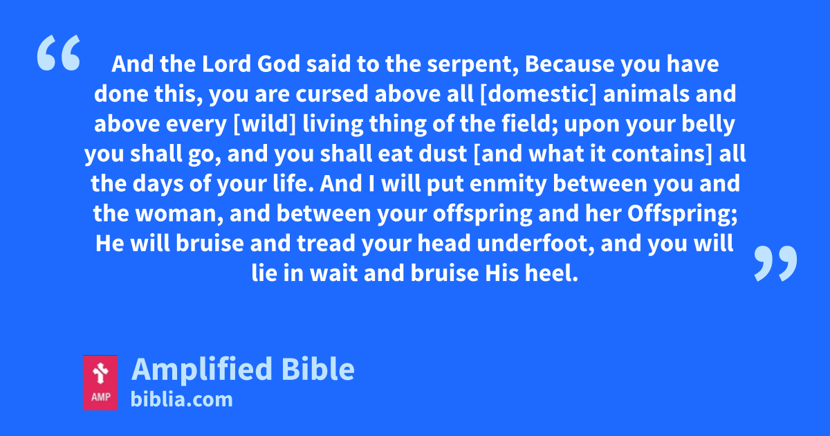 And the Lord God said to the serpent, Because you have done this, you are cursed above all [domestic] animals and above every [wild] living thing of the field; upon your belly you shall go, and you shall eat dust [and what it contains] all the days of your life. And I will put enmity between you and the woman, and between your offspring and her Offspring; He will bruise and tread your head underfoot, and you will lie in wait and bruise His heel.