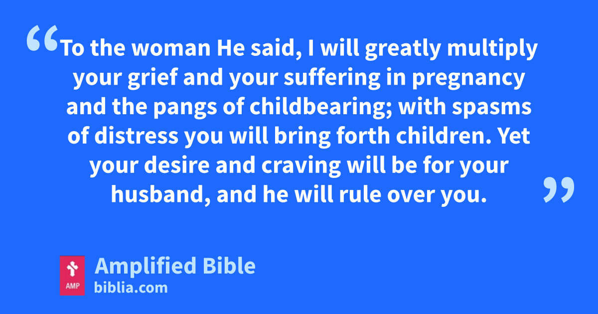 To the woman He said, I will greatly multiply your grief and your suffering in pregnancy and the pangs of childbearing; with spasms of distress you will bring forth children. Yet your desire and craving will be for your husband, and he will rule over you.