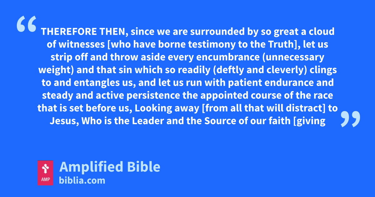 THEREFORE THEN, since we are surrounded by so great a cloud of witnesses [who have borne testimony to the Truth], let us strip off and throw aside every encumbrance (unnecessary weight) and that sin which so readily (deftly and cleverly) clings to and entangles us, and let us run with patient endurance and steady and active persistence the appointed course of the race that is set before us, Looking away [from all that will distract] to Jesus, Who is the Leader and the Source of our faith [giving