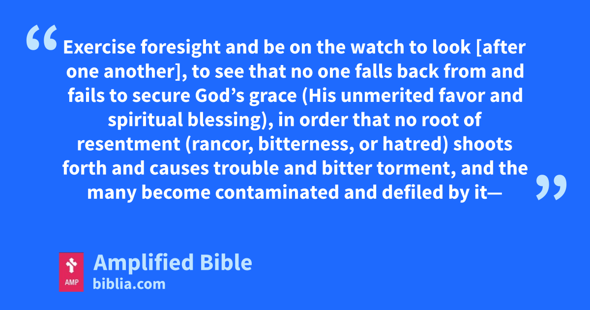 Exercise foresight and be on the watch to look [after one another], to see that no one falls back from and fails to secure God’s grace (His unmerited favor and spiritual blessing), in order that no root of resentment (rancor, bitterness, or hatred) shoots forth and causes trouble and bitter torment, and the many become contaminated and defiled by it—