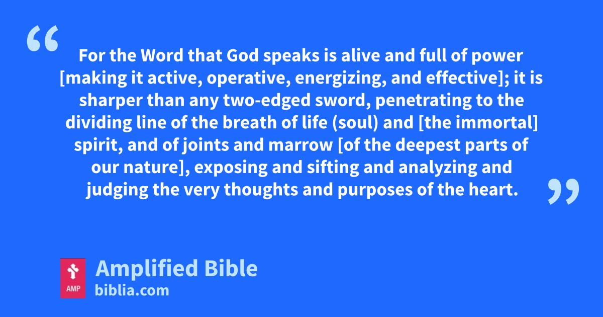 For the Word that God speaks is alive and full of power [making it active, operative, energizing, and effective]; it is sharper than any two-edged sword, penetrating to the dividing line of the breath of life (soul) and [the immortal] spirit, and of joints and marrow [of the deepest parts of our nature], exposing and sifting and analyzing and judging the very thoughts and purposes of the heart.