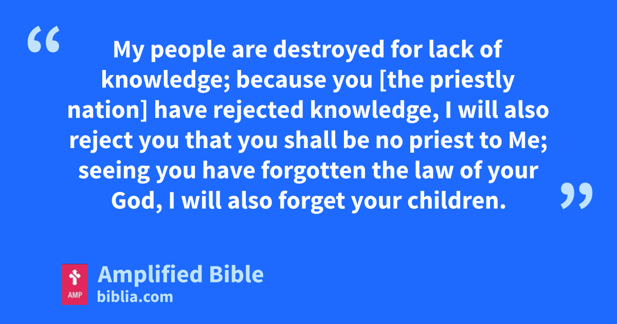 My people are destroyed for lack of knowledge; because you [the priestly nation] have rejected knowledge, I will also reject you that you shall be no priest to Me; seeing you have forgotten the law of your God, I will also forget your children.