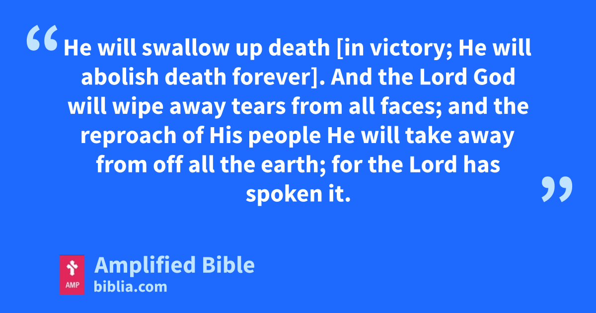 He will swallow up death [in victory; He will abolish death forever]. And the Lord God will wipe away tears from all faces; and the reproach of His people He will take away from off all the earth; for the Lord has spoken it.