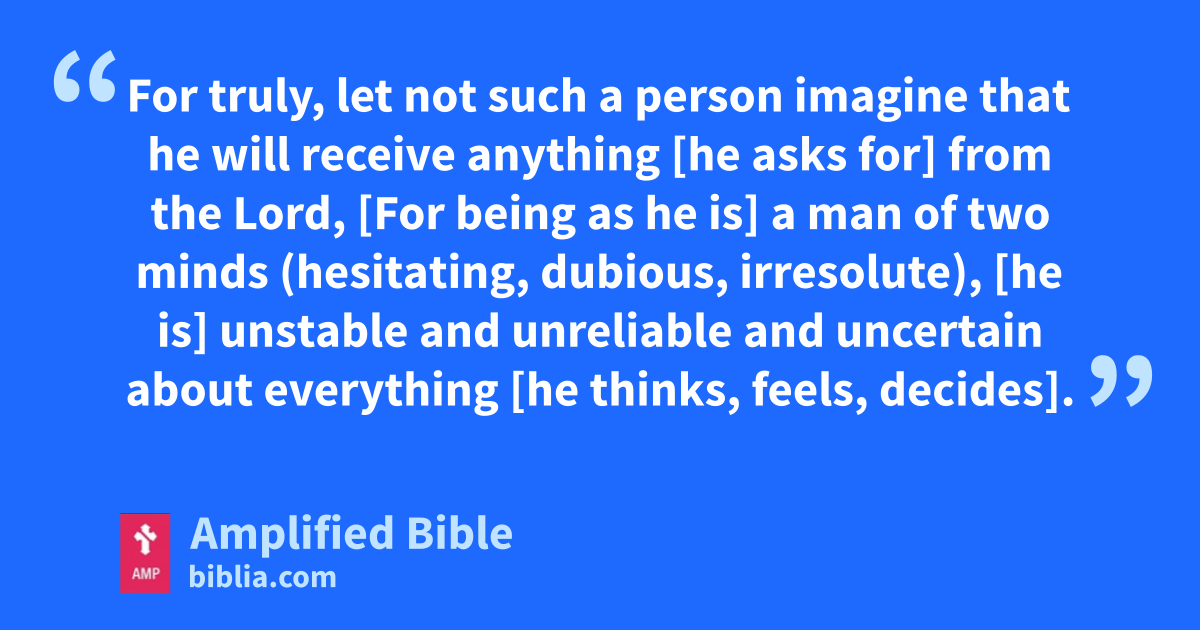 For truly, let not such a person imagine that he will receive anything [he asks for] from the Lord, [For being as he is] a man of two minds (hesitating, dubious, irresolute), [he is] unstable and unreliable and uncertain about everything [he thinks, feels, decides].