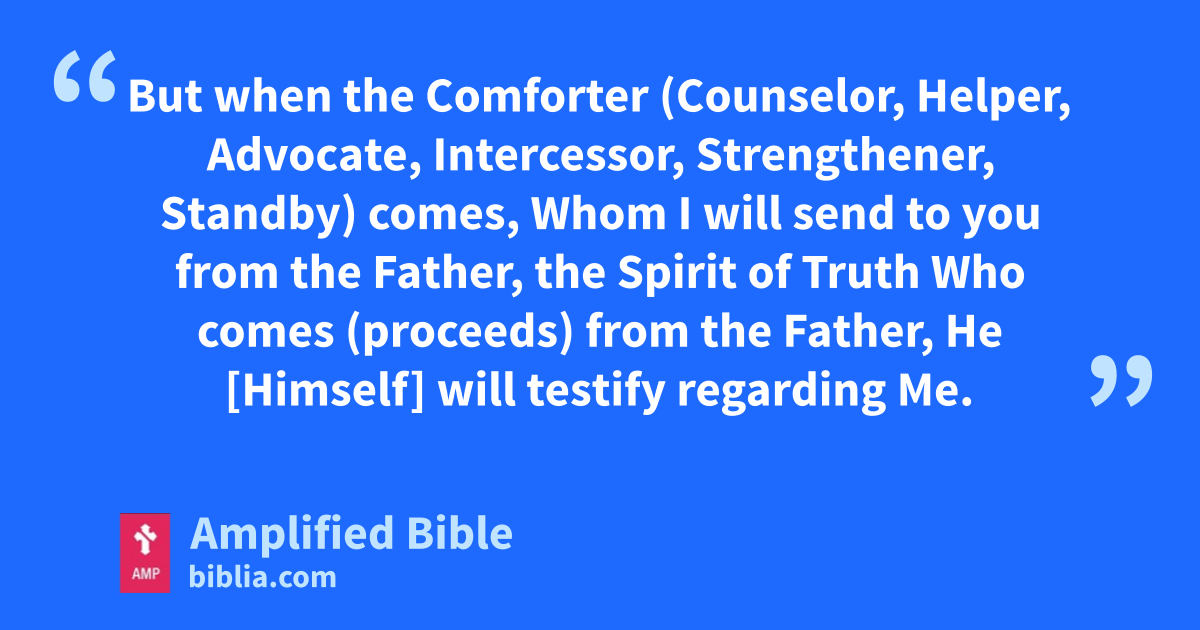 But when the Comforter (Counselor, Helper, Advocate, Intercessor, Strengthener, Standby) comes, Whom I will send to you from the Father, the Spirit of Truth Who comes (proceeds) from the Father, He [Himself] will testify regarding Me.