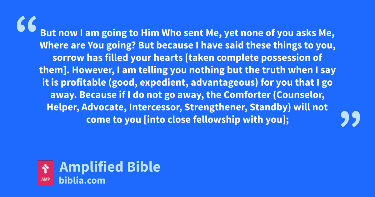 But now I am going to Him Who sent Me, yet none of you asks Me, Where are You going? But because I have said these things to you, sorrow has filled your hearts [taken complete possession of them]. However, I am telling you nothing but the truth when I say it is profitable (good, expedient, advantageous) for you that I go away. Because if I do not go away, the Comforter (Counselor, Helper, Advocate, Intercessor, Strengthener, Standby) will not come to you [into close fellowship with you];