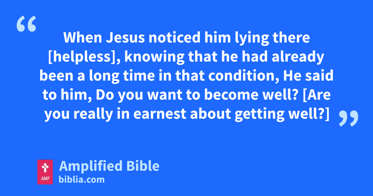When Jesus noticed him lying there [helpless], knowing that he had already been a long time in that condition, He said to him, Do you want to become well? [Are you really in earnest about getting well?]
