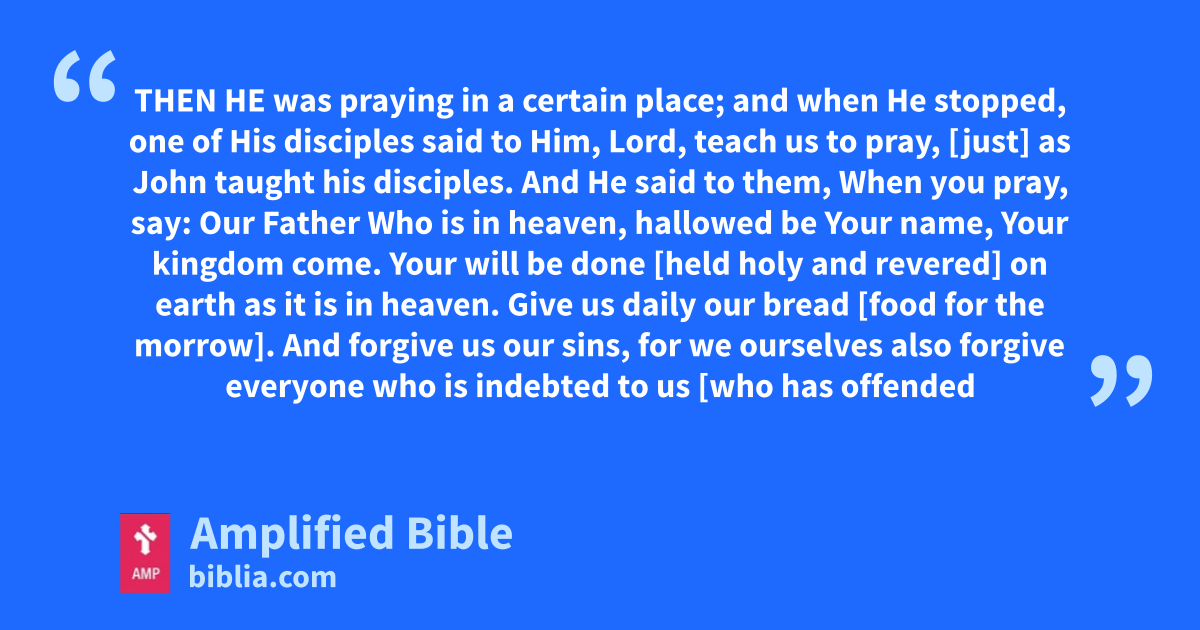 THEN HE was praying in a certain place; and when He stopped, one of His disciples said to Him, Lord, teach us to pray, [just] as John taught his disciples. And He said to them, When you pray, say: Our Father Who is in heaven, hallowed be Your name, Your kingdom come. Your will be done [held holy and revered] on earth as it is in heaven. Give us daily our bread [food for the morrow]. And forgive us our sins, for we ourselves also forgive everyone who is indebted to us [who has offended