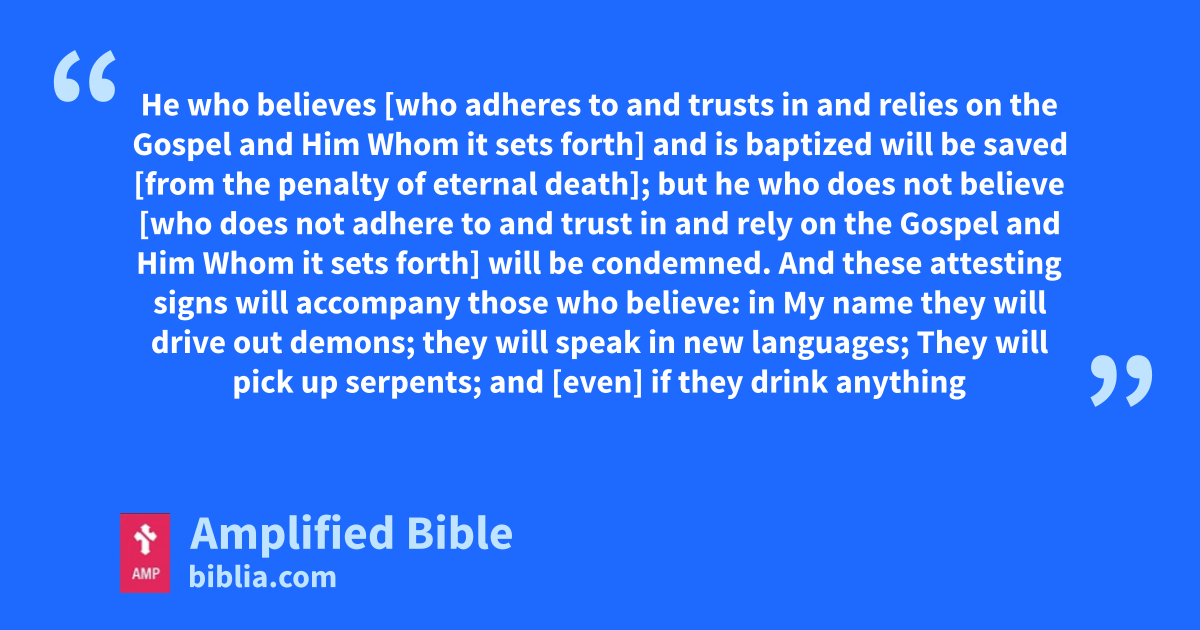 He who believes [who adheres to and trusts in and relies on the Gospel and Him Whom it sets forth] and is baptized will be saved [from the penalty of eternal death]; but he who does not believe [who does not adhere to and trust in and rely on the Gospel and Him Whom it sets forth] will be condemned. And these attesting signs will accompany those who believe: in My name they will drive out demons; they will speak in new languages; They will pick up serpents; and [even] if they drink anything