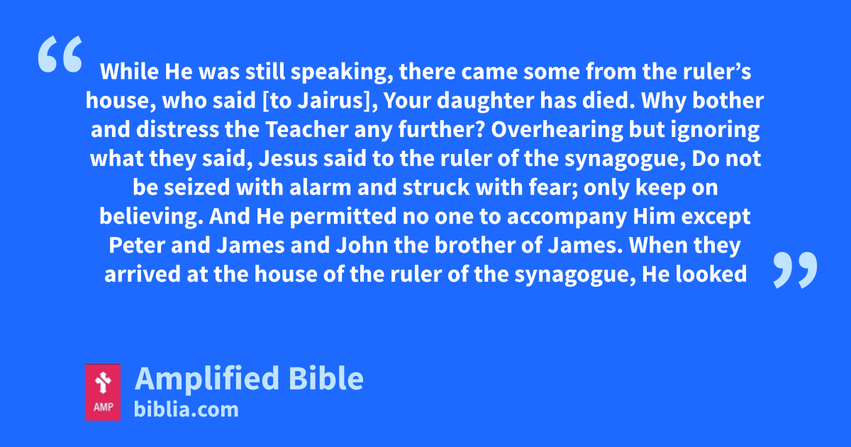 While He was still speaking, there came some from the ruler’s house, who said [to Jairus], Your daughter has died. Why bother and distress the Teacher any further? Overhearing but ignoring what they said, Jesus said to the ruler of the synagogue, Do not be seized with alarm and struck with fear; only keep on believing. And He permitted no one to accompany Him except Peter and James and John the brother of James. When they arrived at the house of the ruler of the synagogue, He looked