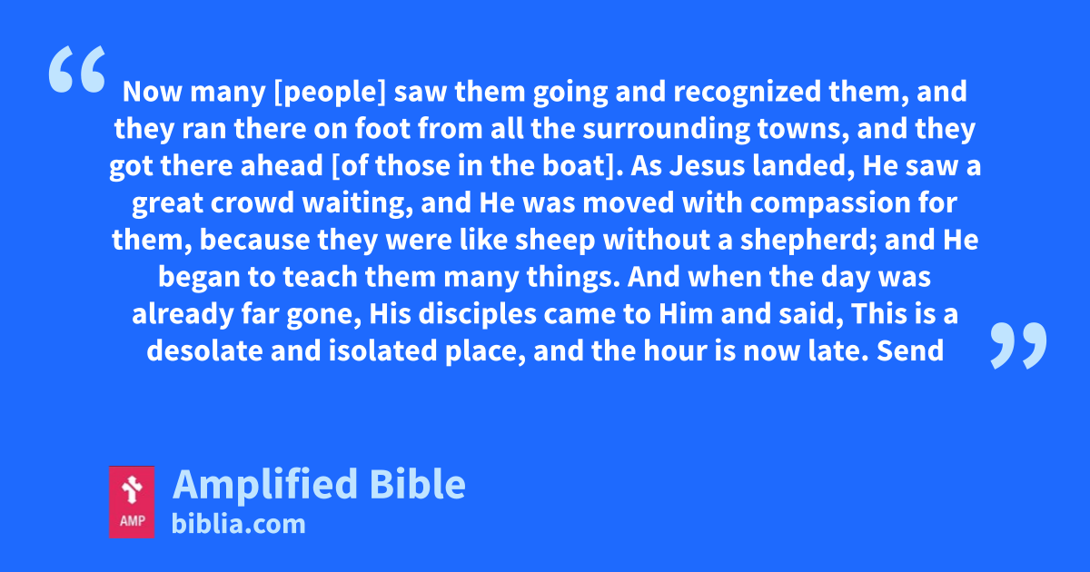 Now many [people] saw them going and recognized them, and they ran there on foot from all the surrounding towns, and they got there ahead [of those in the boat]. As Jesus landed, He saw a great crowd waiting, and He was moved with compassion for them, because they were like sheep without a shepherd; and He began to teach them many things. And when the day was already far gone, His disciples came to Him and said, This is a desolate and isolated place, and the hour is now late. Send