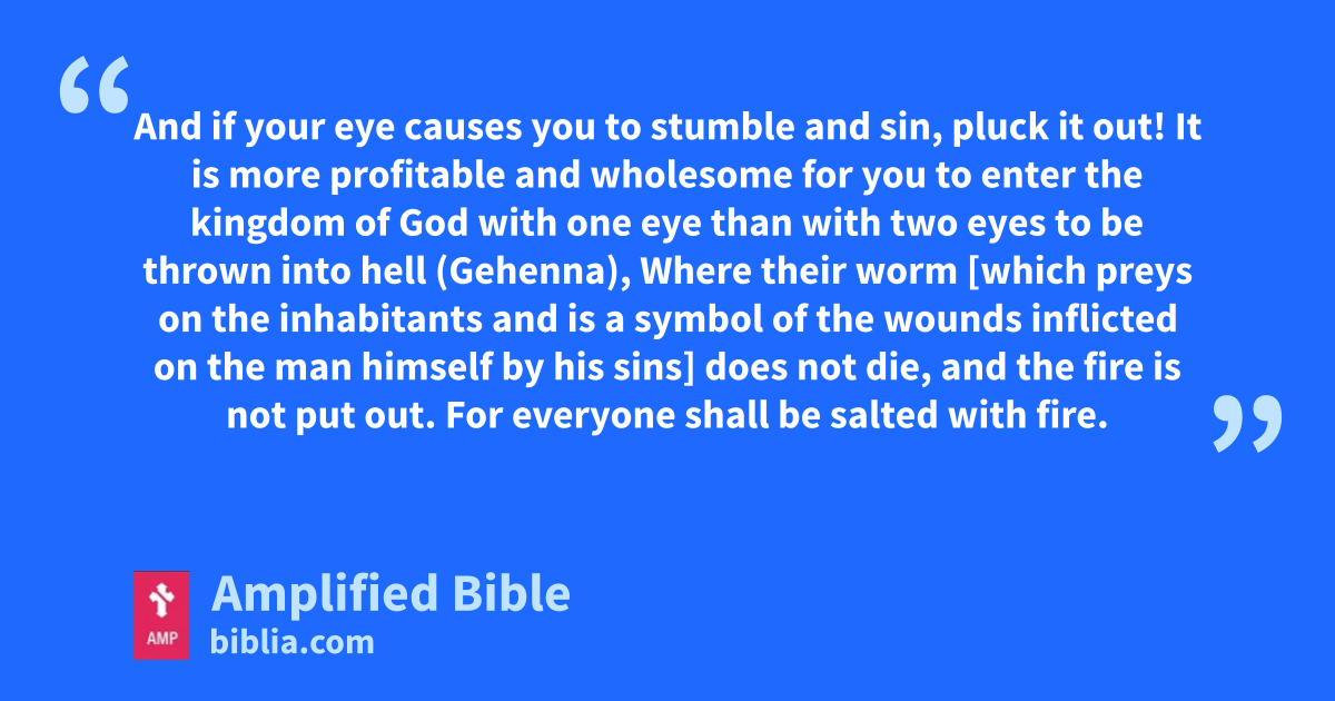 And if your eye causes you to stumble and sin, pluck it out! It is more profitable and wholesome for you to enter the kingdom of God with one eye than with two eyes to be thrown into hell (Gehenna), Where their worm [which preys on the inhabitants and is a symbol of the wounds inflicted on the man himself by his sins] does not die, and the fire is not put out. For everyone shall be salted with fire.