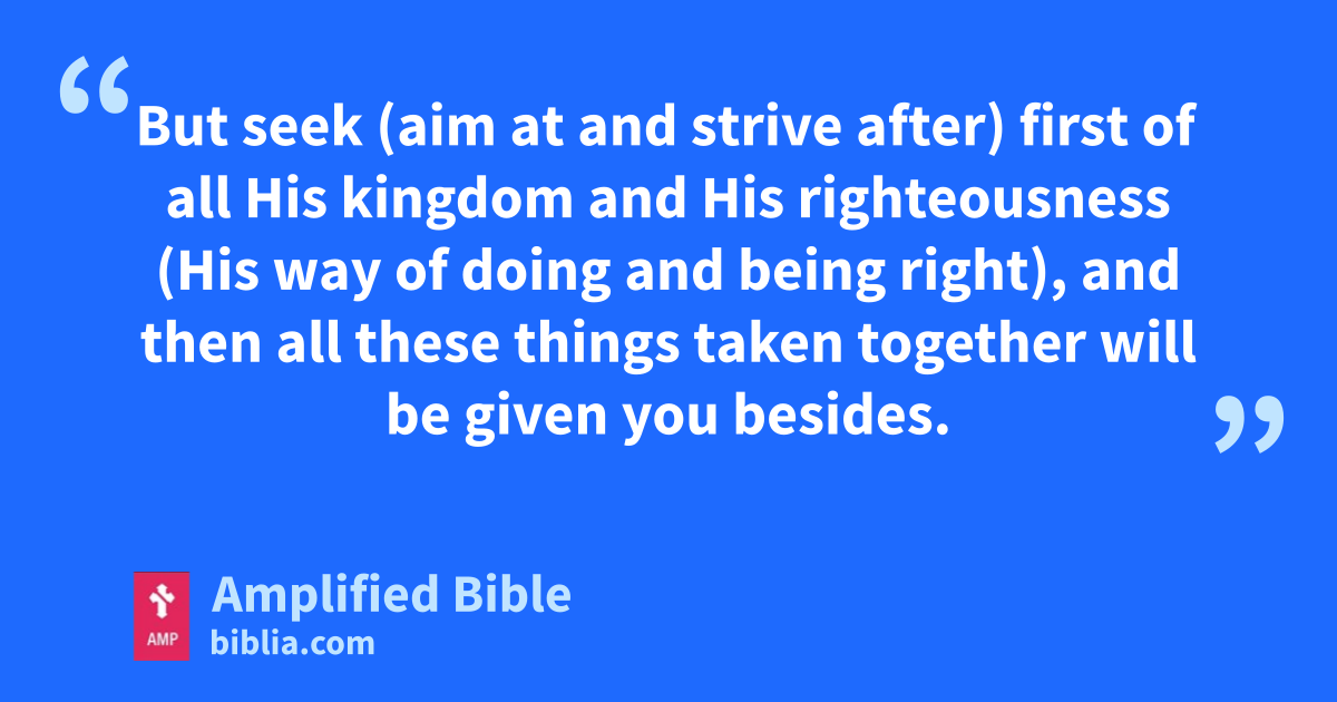 But seek (aim at and strive after) first of all His kingdom and His righteousness (His way of doing and being right), and then all these things taken together will be given you besides.