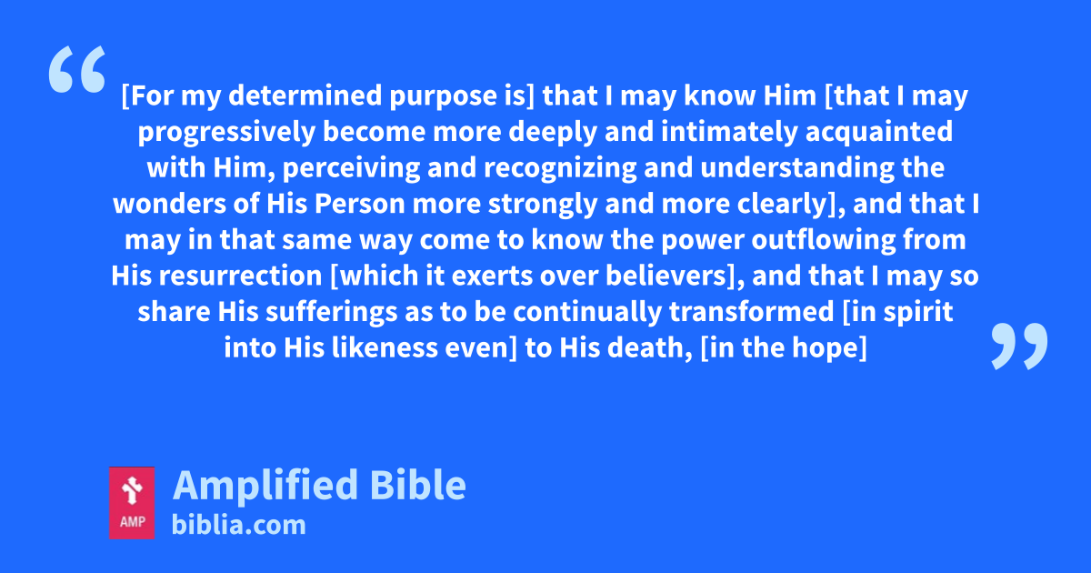[For my determined purpose is] that I may know Him [that I may progressively become more deeply and intimately acquainted with Him, perceiving and recognizing and understanding the wonders of His Person more strongly and more clearly], and that I may in that same way come to know the power outflowing from His resurrection [which it exerts over believers], and that I may so share His sufferings as to be continually transformed [in spirit into His likeness even] to His death, [in the hope]