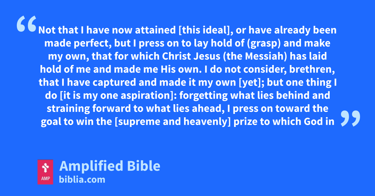 Not that I have now attained [this ideal], or have already been made perfect, but I press on to lay hold of (grasp) and make my own, that for which Christ Jesus (the Messiah) has laid hold of me and made me His own. I do not consider, brethren, that I have captured and made it my own [yet]; but one thing I do [it is my one aspiration]: forgetting what lies behind and straining forward to what lies ahead, I press on toward the goal to win the [supreme and heavenly] prize to which God in