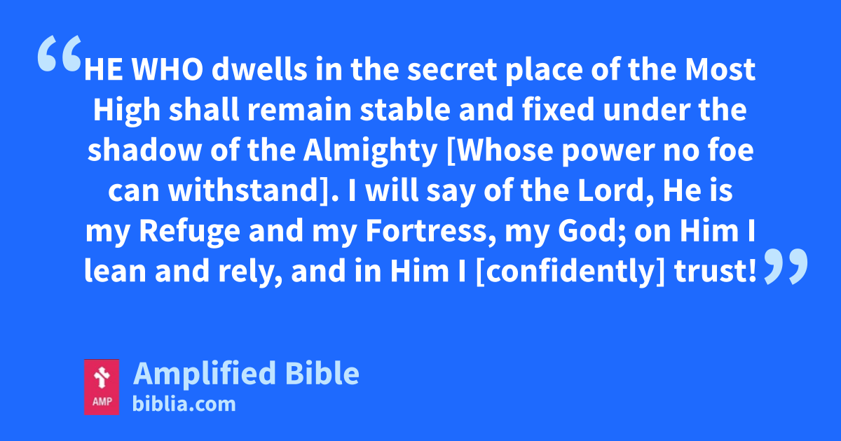 HE WHO dwells in the secret place of the Most High shall remain stable and fixed under the shadow of the Almighty [Whose power no foe can withstand]. I will say of the Lord, He is my Refuge and my Fortress, my God; on Him I lean and rely, and in Him I [confidently] trust!