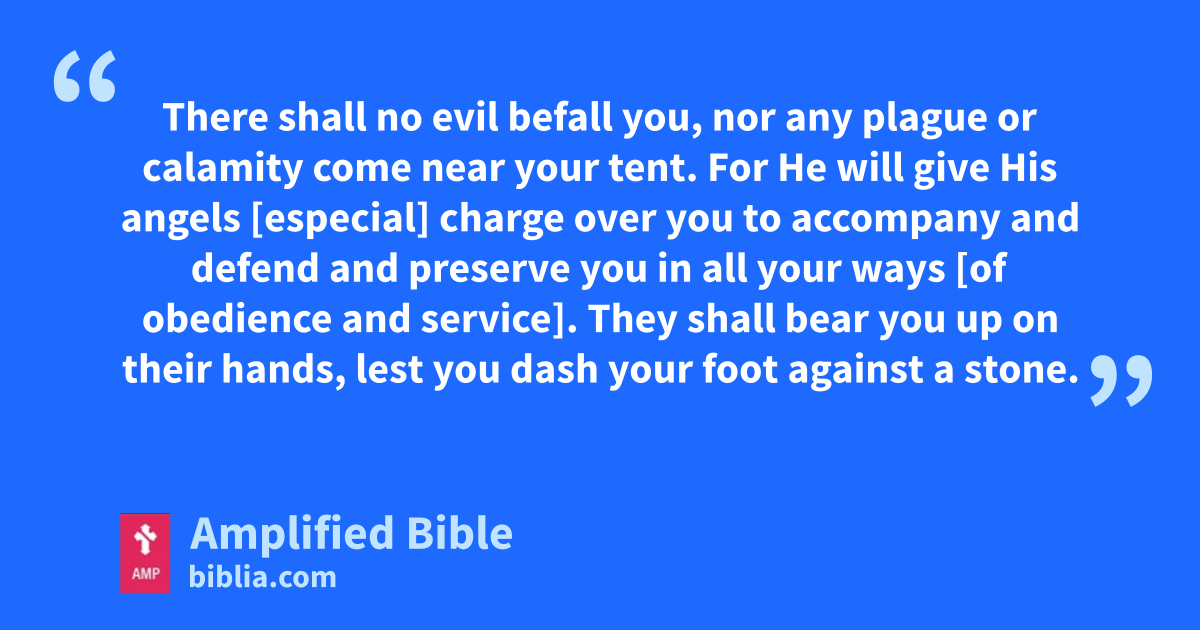 There shall no evil befall you, nor any plague or calamity come near your tent. For He will give His angels [especial] charge over you to accompany and defend and preserve you in all your ways [of obedience and service]. They shall bear you up on their hands, lest you dash your foot against a stone.
