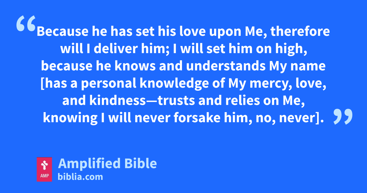 Because he has set his love upon Me, therefore will I deliver him; I will set him on high, because he knows and understands My name [has a personal knowledge of My mercy, love, and kindness—trusts and relies on Me, knowing I will never forsake him, no, never].