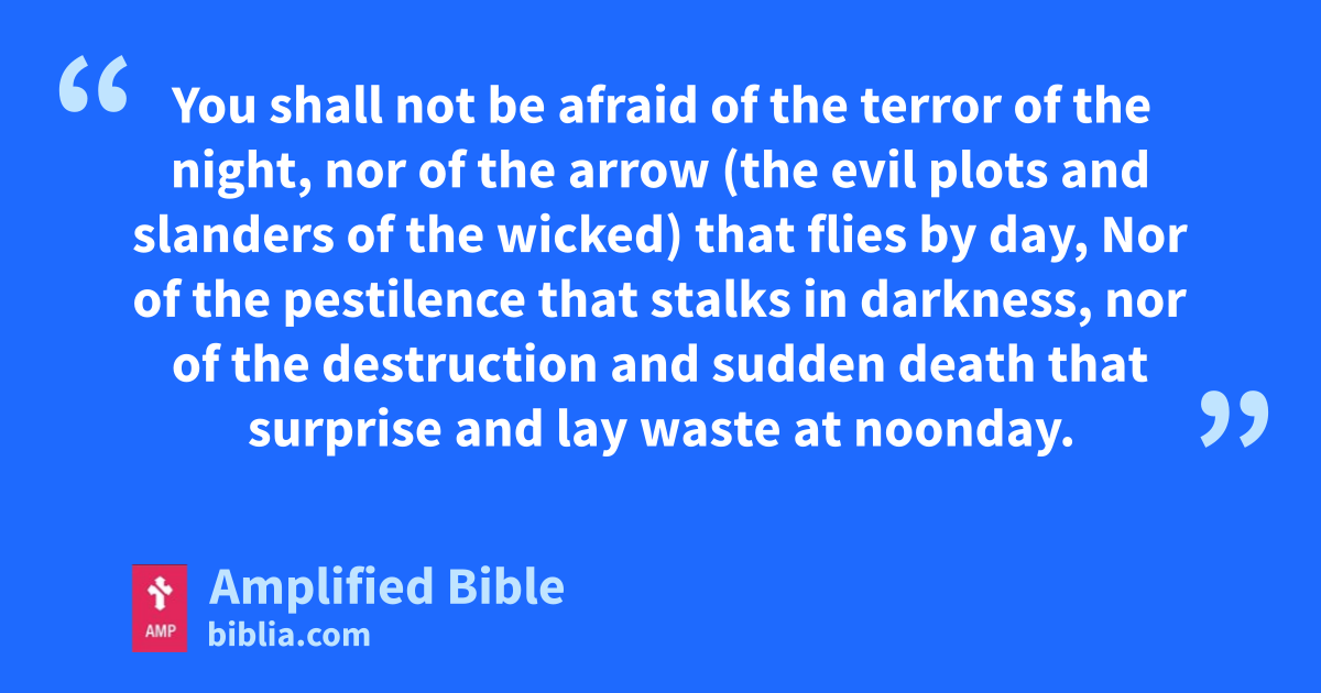 You shall not be afraid of the terror of the night, nor of the arrow (the evil plots and slanders of the wicked) that flies by day, Nor of the pestilence that stalks in darkness, nor of the destruction and sudden death that surprise and lay waste at noonday.