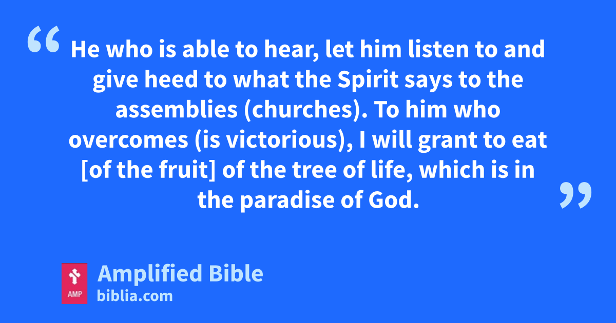 He who is able to hear, let him listen to and give heed to what the Spirit says to the assemblies (churches). To him who overcomes (is victorious), I will grant to eat [of the fruit] of the tree of life, which is in the paradise of God.
