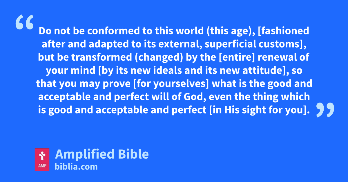 Do not be conformed to this world (this age), [fashioned after and adapted to its external, superficial customs], but be transformed (changed) by the [entire] renewal of your mind [by its new ideals and its new attitude], so that you may prove [for yourselves] what is the good and acceptable and perfect will of God, even the thing which is good and acceptable and perfect [in His sight for you].