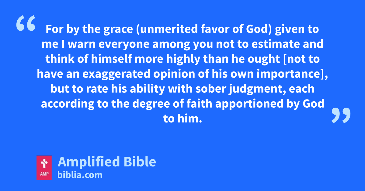 For by the grace (unmerited favor of God) given to me I warn everyone among you not to estimate and think of himself more highly than he ought [not to have an exaggerated opinion of his own importance], but to rate his ability with sober judgment, each according to the degree of faith apportioned by God to him.