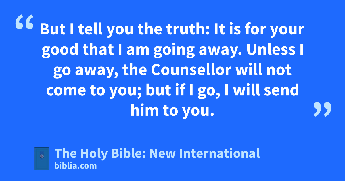 But I tell you the truth: It is for your good that I am going away. Unless I go away, the Counsellor will not come to you; but if I go, I will send him to you.