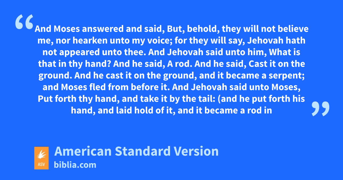 4 And Moses answered and said, But, behold, they will not believe me, nor hearken unto my voice; for they will say, Jehovah hath not appeared unto thee. 2And Jehovah said unto him, What is that in thy hand? And he said, A rod. 3And he said, Cast it on the ground. And he cast it on the ground, and it became a serpent; and Moses fled from before it. 4And Jehovah said unto Moses, Put forth thy hand, and take it by the tail: (and he put forth his hand, and laid hold of it, and it became a rod in his hand); 5that they may believe that Jehovah, the God of their fathers, the God of Abraham, the God of Isaac, and the God of Jacob, hath appeared unto thee. 6And Jehovah said furthermore unto him, Put now thy hand into thy bosom. And he put his hand into his bosom: and when he took it out, behold, his hand was leprous, as white as snow. 7And he said, Put thy hand into thy bosom again. (And he put his hand into his bosom again; and when he took it out of his bosom, behold, it was turned again as his other flesh.) 8And it shall come to pass, if they will not believe thee, neither hearken to the voice of the first sign, that they will believe the voice of the latter sign. 9And it shall come to pass, if they will not believe even these two signs, neither hearken unto thy voice, that thou shalt take of the water of the river, and pour it upon the dry land: and the water which thou takest out of the river shall become blood upon the dry land.