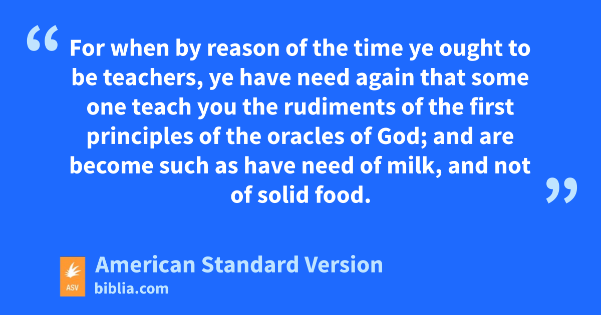 11Of whom we have many things to say, and hard of interpretation, seeing ye are become dull of hearing. 12For when by reason of the time ye ought to be teachers, ye have need again that some one teach you the rudiments of the first principles of the oracles of God; and are become such as have need of milk, and not of solid food. 13For every one that partaketh of milk is without experience of the word of righteousness; for he is a babe. 14But solid food is for fullgrown men, even those who by reason of use have their senses exercised to discern good and evil.
