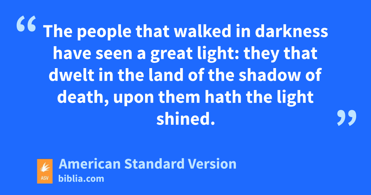 9 But there shall be no gloom to her that was in anguish. In the former time he brought into contempt the land of Zebulun and the land of Naphtali; but in the latter time hath he made it glorious, by the way of the sea, beyond the Jordan, Galilee of the nations. 2The people that walked in darkness have seen a great light: they that dwelt in the land of the shadow of death, upon them hath the light shined. 3Thou hast multiplied the nation, thou hast increased their joy: they joy before thee according to the joy in harvest, as men rejoice when they divide the spoil. 4For the yoke of his burden, and the staff of his shoulder, the rod of his oppressor, thou hast broken as in the day of Midian. 5For all the armor of the armed man in the tumult, and the garments rolled in blood, shall be for burning, for fuel of fire. 6For unto us a child is born, unto us a son is given; and the government shall be upon his shoulder: and his name shall be called Wonderful, Counsellor, Mighty God, Everlasting Father, Prince of Peace. 7Of the increase of his government and of peace there shall be no end, upon the throne of David, and upon his kingdom, to establish it, and to uphold it with justice and with righteousness from henceforth even for ever. The zeal of Jehovah of hosts will perform this.