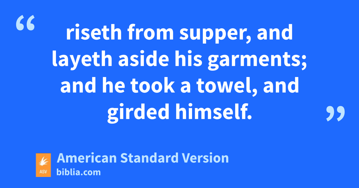 13 Now before the feast of the passover, Jesus knowing that his hour was come that he should depart out of this world unto his Father, having loved his own that were in the world, he loved them unto the end. 2And during supper, the devil having already put into the heart of Judas Iscariot, Simon’s son, to betray him, 3Jesus, knowing that the Father had given all things into his hands, and that he came forth from God, and goeth unto God, 4riseth from supper, and layeth aside his garments; and he took a towel, and girded himself. 5Then he poureth water into the basin, and began to wash the disciples’ feet, and to wipe them with the towel wherewith he was girded. 6So he cometh to Simon Peter. He saith unto him, Lord, dost thou wash my feet? 7Jesus answered and said unto him, What I do thou knowest not now; but thou shalt understand hereafter. 8Peter saith unto him, Thou shalt never wash my feet. Jesus answered him, If I wash thee not, thou hast no part with me. 9Simon Peter saith unto him, Lord, not my feet only, but also my hands and my head. 10Jesus saith to him, He that is bathed needeth not save to wash his feet, but is clean every whit: and ye are clean, but not all. 11For he knew him that should betray him; therefore said he, Ye are not all clean.