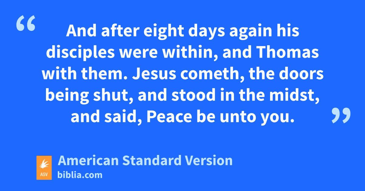 26And after eight days again his disciples were within, and Thomas with them. Jesus cometh, the doors being shut, and stood in the midst, and said, Peace be unto you. 27Then saith he to Thomas, Reach hither thy finger, and see my hands; and reach hither thy hand, and put it into my side: and be not faithless, but believing. 28Thomas answered and said unto him, My Lord and my God. 29Jesus saith unto him, Because thou hast seen me, thou hast believed: blessed are they that have not seen, and yet have believed.