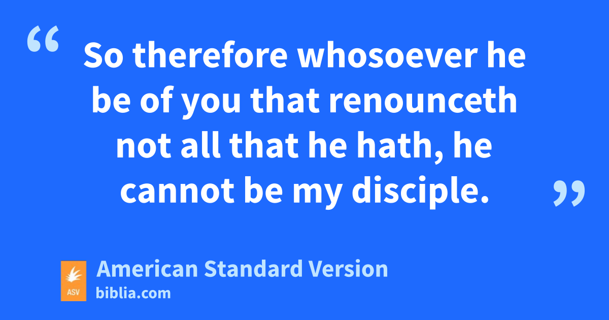 25Now there went with him great multitudes: and he turned, and said unto them, 26If any man cometh unto me, and hateth not his own father, and mother, and wife, and children, and brethren, and sisters, yea, and his own life also, he cannot be my disciple. 27Whosoever doth not bear his own cross, and come after me, cannot be my disciple. 28For which of you, desiring to build a tower, doth not first sit down and count the cost, whether he have wherewith to complete it? 29Lest haply, when he hath laid a foundation, and is not able to finish, all that behold begin to mock him, 30saying, This man began to build, and was not able to finish. 31Or what king, as he goeth to encounter another king in war, will not sit down first and take counsel whether he is able with ten thousand to meet him that cometh against him with twenty thousand? 32Or else, while the other is yet a great way off, he sendeth an ambassage, and asketh conditions of peace. 33So therefore whosoever he be of you that renounceth not all that he hath, he cannot be my disciple. 34Salt therefore is good: but if even the salt have lost its savor, wherewith shall it be seasoned? 35It is fit neither for the land nor for the dunghill: men cast it out. He that hath ears to hear, let him hear.