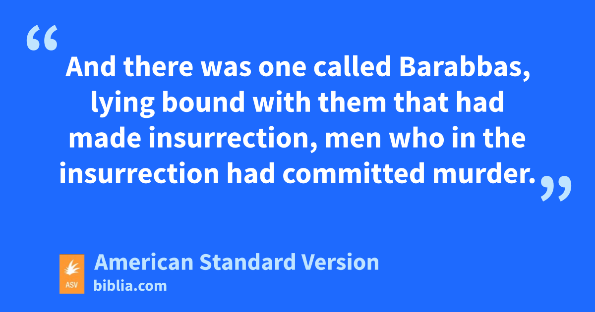 6Now at the feast he used to release unto them one prisoner, whom they asked of him. 7And there was one called Barabbas, lying bound with them that had made insurrection, men who in the insurrection had committed murder. 8And the multitude went up and began to ask him to do as he was wont to do unto them. 9And Pilate answered them, saying, Will ye that I release unto you the King of the Jews? 10For he perceived that for envy the chief priests had delivered him up. 11But the chief priests stirred up the multitude, that he should rather release Barabbas unto them. 12And Pilate again answered and said unto them, What then shall I do unto him whom ye call the King of the Jews? 13And they cried out again, Crucify him. 14And Pilate said unto them, Why, what evil hath he done? But they cried out exceedingly, Crucify him. 15And Pilate, wishing to content the multitude, released unto them Barabbas, and delivered Jesus, when he had scourged him, to be crucified.