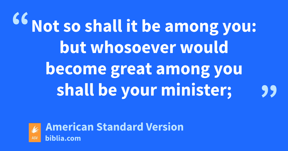 20Then came to him the mother of the sons of Zebedee with her sons, worshipping him, and asking a certain thing of him. 21And he said unto her, What wouldest thou? She saith unto him, Command that these my two sons may sit, one on thy right hand, and one on thy left hand, in thy kingdom. 22But Jesus answered and said, Ye know not what ye ask. Are ye able to drink the cup that I am about to drink? They say unto him, We are able. 23He saith unto them, My cup indeed ye shall drink: but to sit on my right hand, and on my left hand, is not mine to give; but it is for them for whom it hath been prepared of my Father. 24And when the ten heard it, they were moved with indignation concerning the two brethren. 25But Jesus called them unto him, and said, Ye know that the rulers of the Gentiles lord it over them, and their great ones exercise authority over them. 26Not so shall it be among you: but whosoever would become great among you shall be your minister; 27and whosoever would be first among you shall be your servant: 28even as the Son of man came not to be ministered unto, but to minister, and to give his life a ransom for many. 29And as they went out from Jericho, a great multitude followed him.