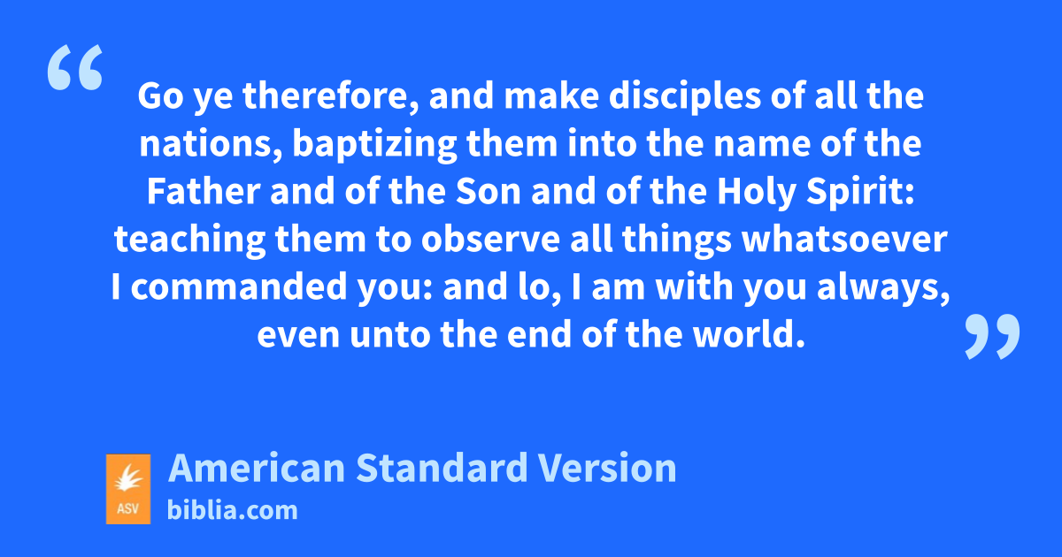 16But the eleven disciples went into Galilee, unto the mountain where Jesus had appointed them. 17And when they saw him, they worshipped him; but some doubted. 18And Jesus came to them and spake unto them, saying, All authority hath been given unto me in heaven and on earth. 19Go ye therefore, and make disciples of all the nations, baptizing them into the name of the Father and of the Son and of the Holy Spirit: 20teaching them to observe all things whatsoever I commanded you: and lo, I am with you always, even unto the end of the world.