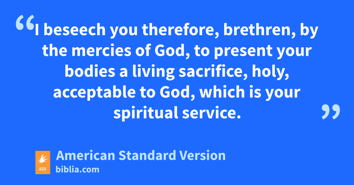 12 I beseech you therefore, brethren, by the mercies of God, to present your bodies a living sacrifice, holy, acceptable to God, which is your spiritual service. 2And be not fashioned according to this world: but be ye transformed by the renewing of your mind, that ye may prove what is the good and acceptable and perfect will of God.