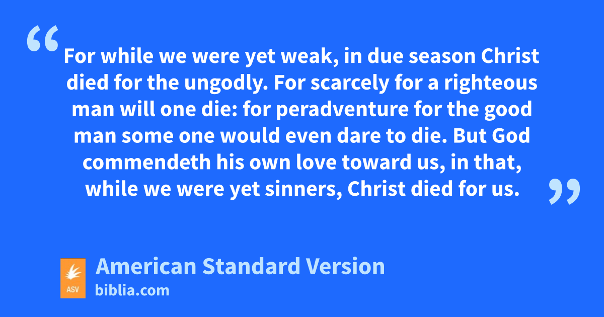 5 Being therefore justified by faith, we have peace with God through our Lord Jesus Christ; 2through whom also we have had our access by faith into this grace wherein we stand; and we rejoice in hope of the glory of God. 3And not only so, but we also rejoice in our tribulations: knowing that tribulation worketh stedfastness; 4and stedfastness, approvedness; and approvedness, hope: 5and hope putteth not to shame; because the love of God hath been shed abroad in our hearts through the Holy Spirit which was given unto us. 6For while we were yet weak, in due season Christ died for the ungodly. 7For scarcely for a righteous man will one die: for peradventure for the good man some one would even dare to die. 8But God commendeth his own love toward us, in that, while we were yet sinners, Christ died for us. 9Much more then, being now justified by his blood, shall we be saved from the wrath of God through him. 10For if, while we were enemies, we were reconciled to God through the death of his Son, much more, being reconciled, shall we be saved by his life; 11and not only so, but we also rejoice in God through our Lord Jesus Christ, through whom we have now received the reconciliation.