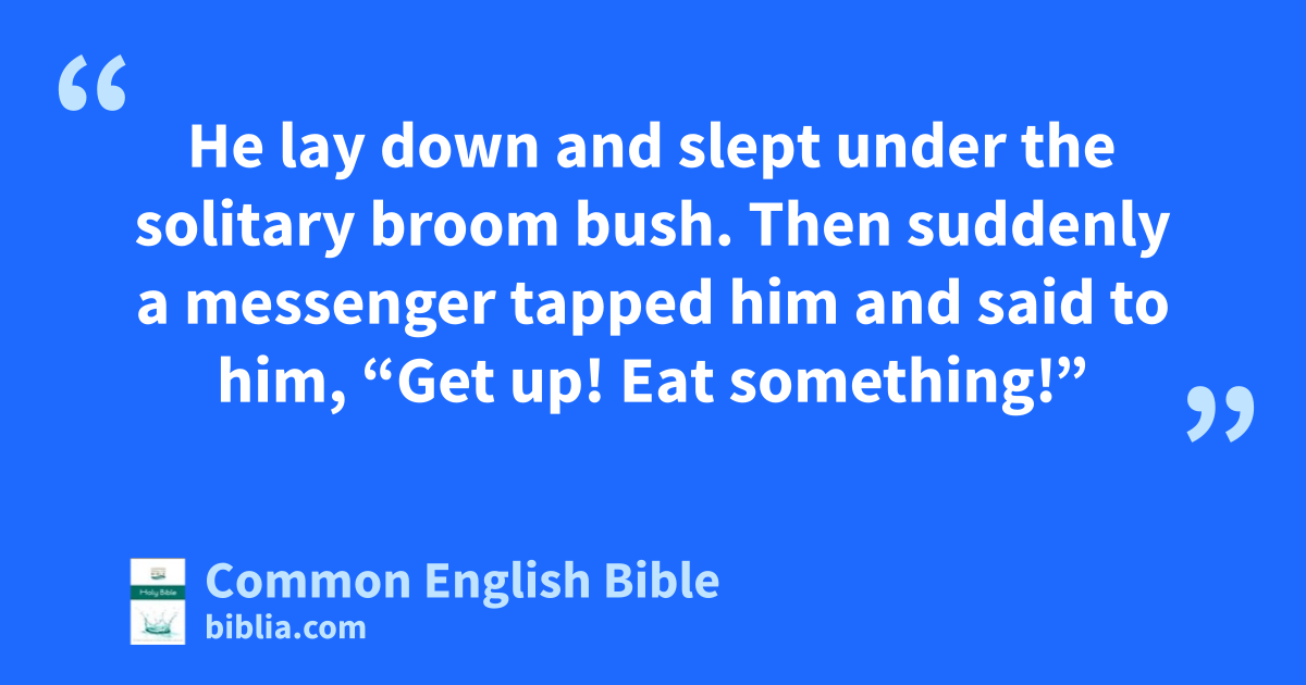 He lay down and slept under the solitary broom bush. Then suddenly a messenger tapped him and said to him, “Get up! Eat something!”