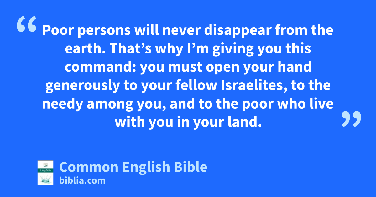 Poor persons will never disappear from the earth. That’s why I’m giving you this command: you must open your hand generously to your fellow Israelites, to the needy among you, and to the poor who live with you in your land.